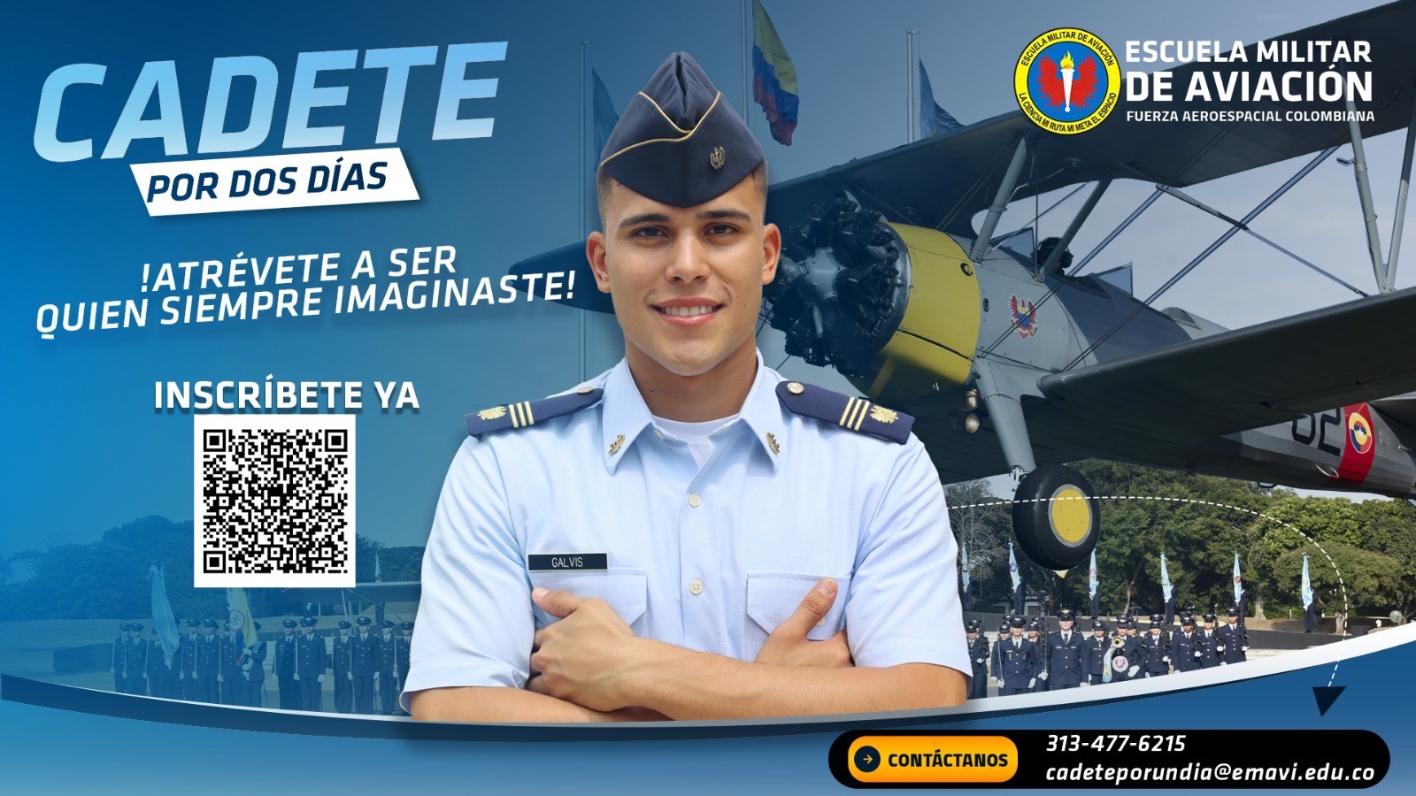 Inscripciones abiertas hasta el 02 de marzo de 2026. Para mayor información los interesados pueden escribir al correo: cadeteporundia@emavi.edu.co o llamar al número de contacto 313 477 6215.